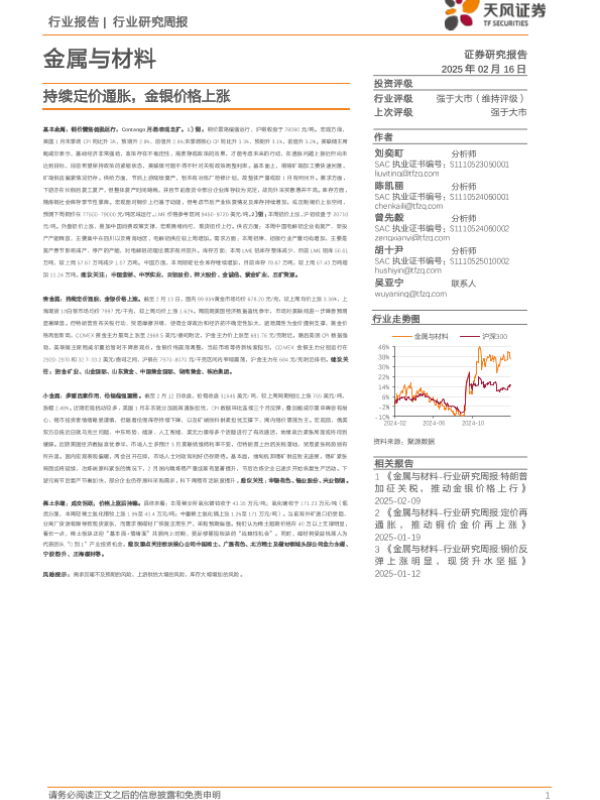 【天风证券】【20250216】金属与材料行业研究周报:持续定价通胀,金银价格上涨-15页 行业研究