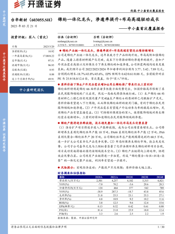 【开源证券】【20230321】台华新材-中小盘首次覆盖报告:锦纶一体化龙头,渗透率提升+布局高端驱动成长-30页 证券期货研究报告