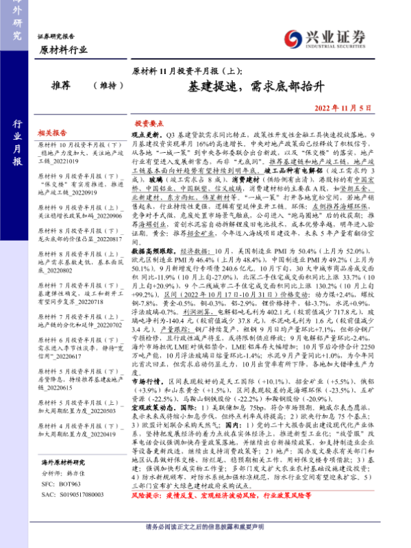 【兴业证券】【20221105】原材料 11月投资半月报(上):基建提速,需求底部抬升-26页 行业研究
