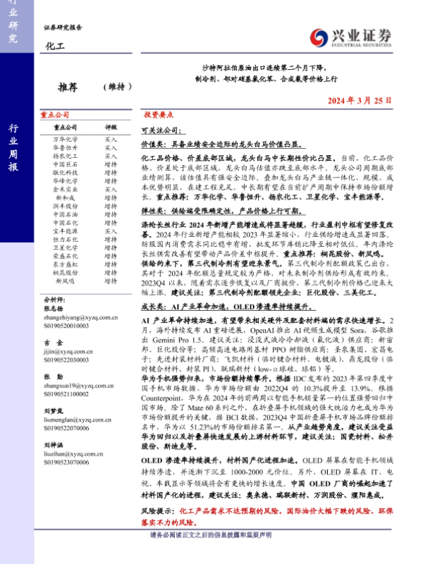 【兴业证券】【20240325】沙特阿拉伯原油出口连续第二个月下降,制冷剂、邻对硝基氯化苯、合成氨等价格上行-20页 行业研究