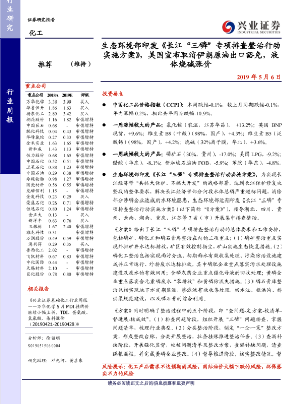【兴业证券】【20190506】20190506-兴业证券-化工行业周报:生态环境部印发《长江“三磷”专项排查整治行动实施方案》,美国宣布取消伊朗原油出口豁免,液体烧碱涨价-29页 行业研究