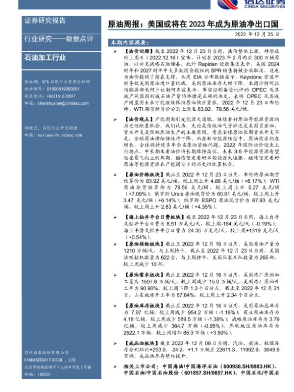 【信达证券】【20221225】原油周报:美国或将在2023年成为原油净出口国-26页 行业研究