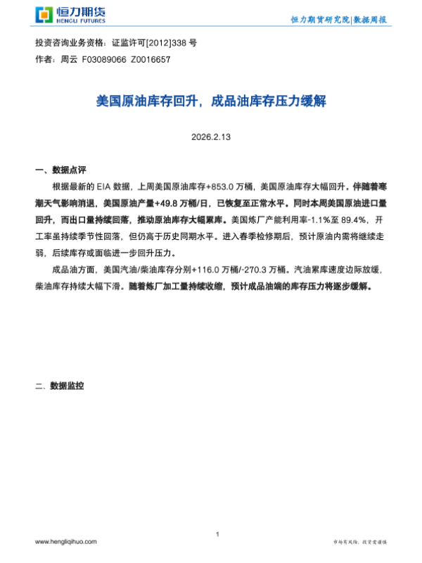 【恒力期货】【202602】美国原油库存回升_成品油库存压力缓解-3页 证券期货研究报告