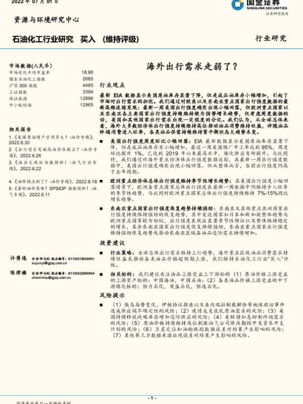 【国金证券】【20220701】20220701-国金证券-石油化工行业研究:海外出行需求走弱了?-12页 行业研究
