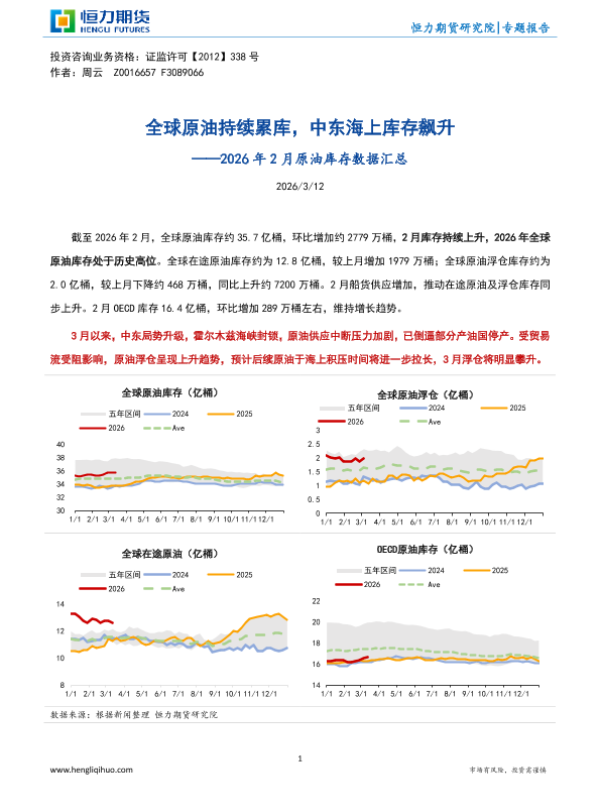 【恒力期货】【202602】全球原油持续累库,中东海上库存飙升——2026年 2月原油库存数据汇总-7页 证券期货研究报告