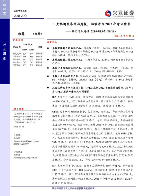 【兴业证券】【20210920】石化行业周报:三大机构发布原油月报,继续看好2022年原油需求-14页 行业研究