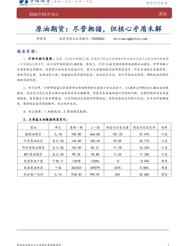 【宁证期货】【202603】原油期货:尽管抛储,但核心矛盾未解决-7页 证券期货研究报告