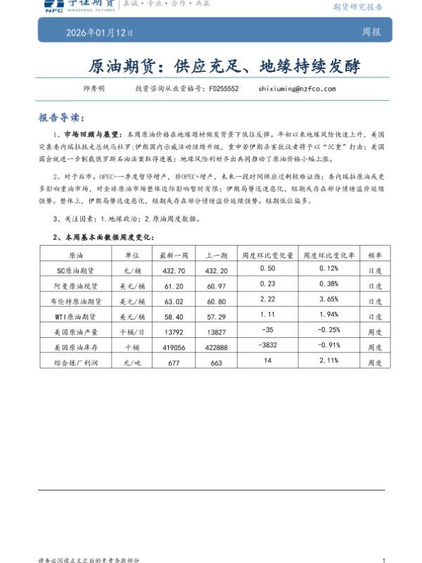 【宁证期货】【202601】原油期货:供应充足、地缘持续发酵-7页 证券期货研究报告