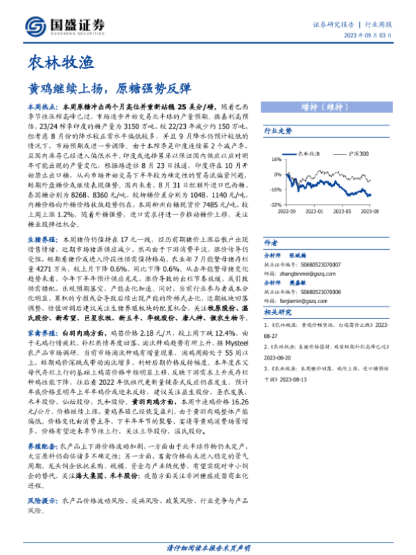 【国盛证券】【20230903】20230903-国盛证券-农林牧渔行业周报:黄鸡继续上扬,原糖强势反弹-13页 行业研究