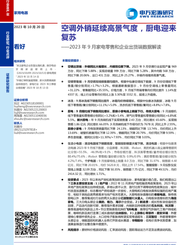 【申万宏源】【20231020】家用电器行业2023年9月家电零售和企业出货端数据解读:空调外销延续高景气度,厨电迎来复苏-18页 行业研究