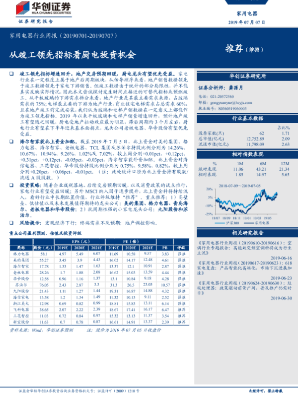 【华创证券】【20190707】家用电器行业周报:从竣工领先指标看厨电投资机会-15页 行业研究