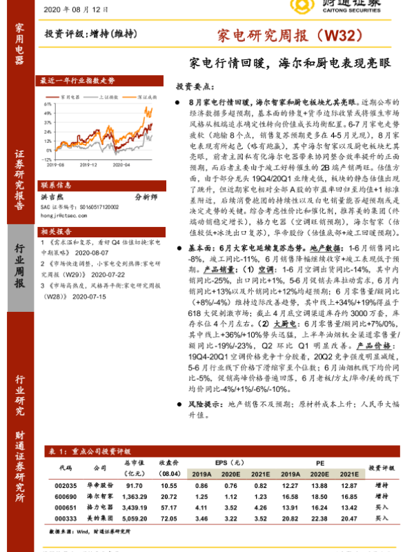 【财通证券】【20200812】20200812-财通证券-家电研究周报(W32):家电行情回暖,海尔和厨电表现亮眼-20页 行业研究