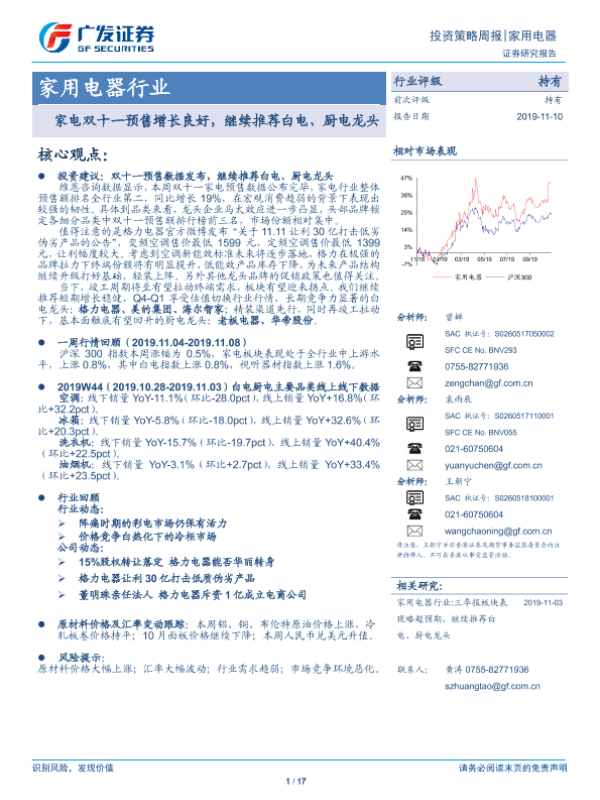【广发证券】【20191110】20191110-广发证券-家用电器行业投资策略周报:家电双十一预售增长良好,继续推荐白电、厨电龙头-17页 行业研究