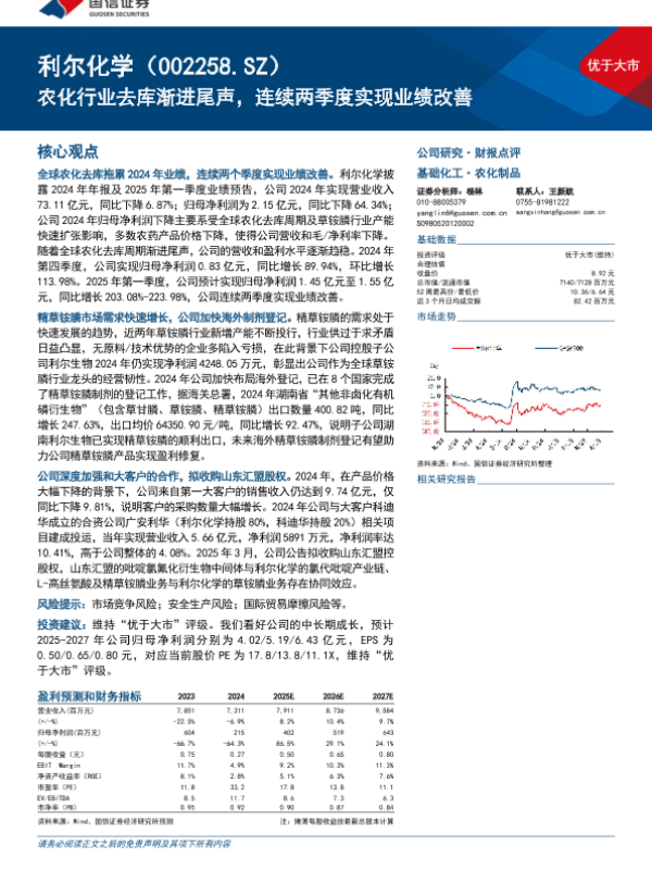 【国信证券】【20240407】利尔化学农化行业去库渐进尾声,连续两季度实现业绩改善-20页 公司研究