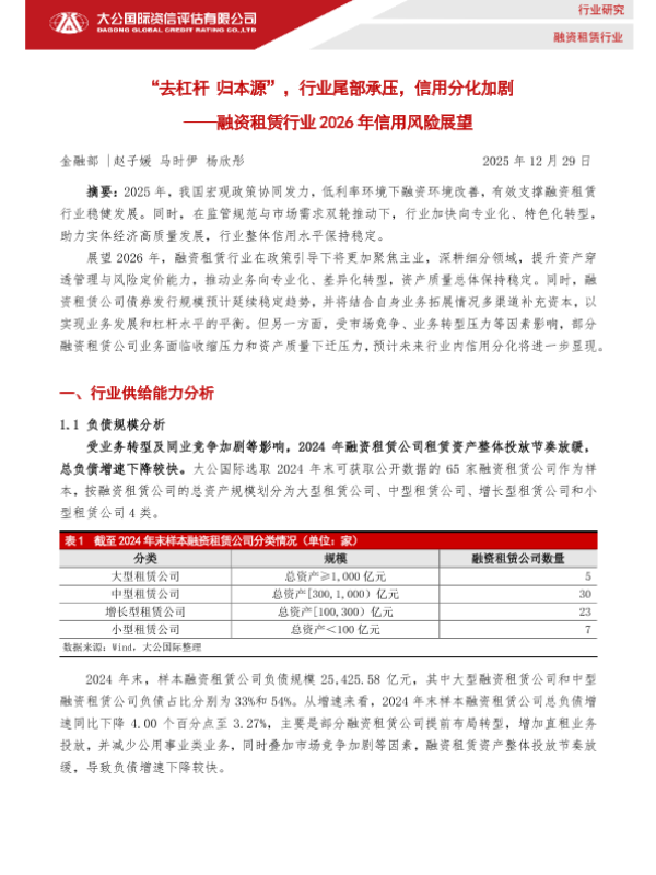 【大公国际】【202512】“去杠杆归本源”,行业尾部承压,信用分化加剧——融资租赁行业 2026年信用风险展望-9页 行业研究