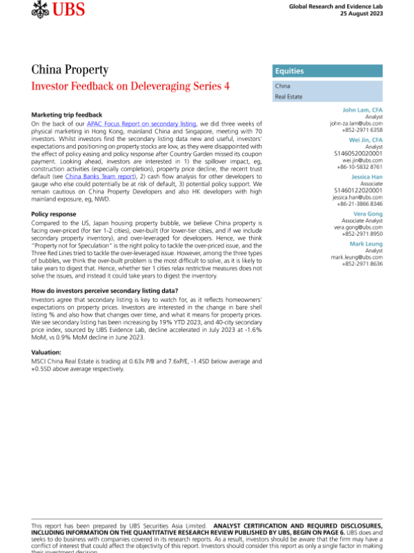 【UBS Securities Asia Limited】【20230825】China Property Investor Feedback on Deleveraging Series 4-16页 行业研究