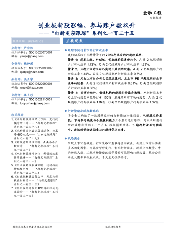 【华安证券】【20230731】“打新定期跟踪”系列之一百三十五:创业板新股涨幅、参与账户数双升-22页 行业研究