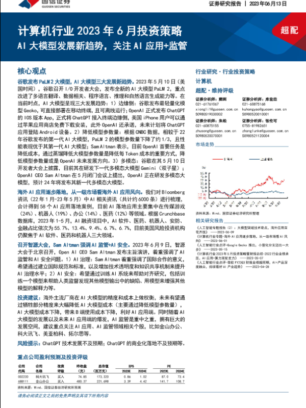 【国信证券】【20230613】计算机行业2023年6月投资策略:AI大模型发展新趋势,关注AI应用+监管-16页 行业研究