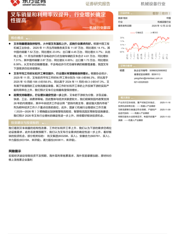 【东方证券】【202512】叉车销量和利用率双提升,行业增长确定性提高-4页 证券期货研究报告