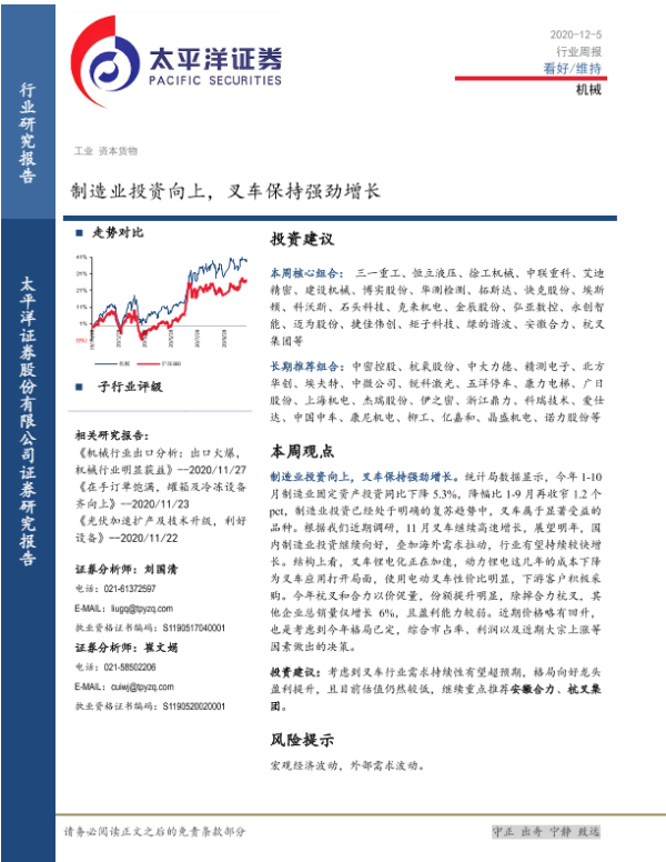 【太平洋证券】【20201205】机械行业周报:制造业投资向上,叉车保持强劲增长-13页 行业研究