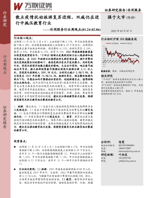 【万联证券】【20220207】休闲服务行业周观点:散点疫情扰动旅游复苏进程,双减仍在进行中施压教育行业-10页 行业研究