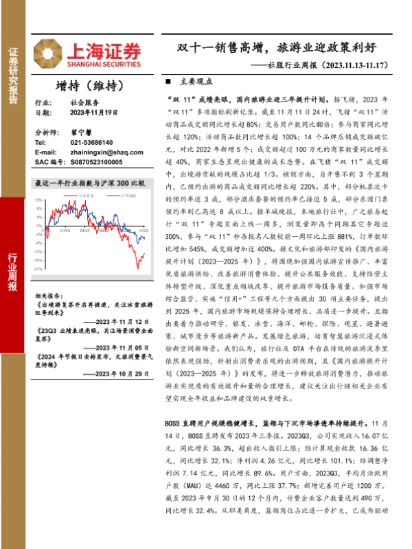 【上海证券】【20231119】社服行业周报:双十一销售高增,旅游业迎政策利好-12页 行业研究