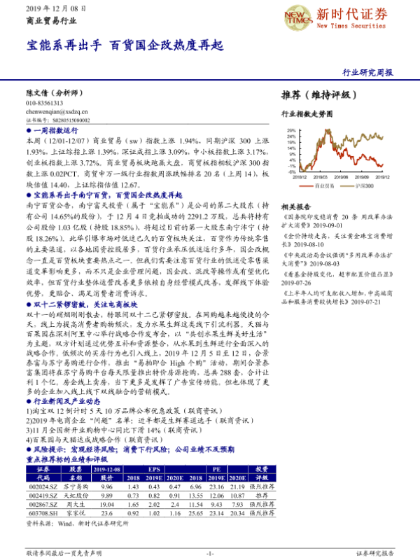 【新时代证券】【20191208】商业贸易行业研究周报:宝能系再出手 百货国企改热度再起-9页 行业研究