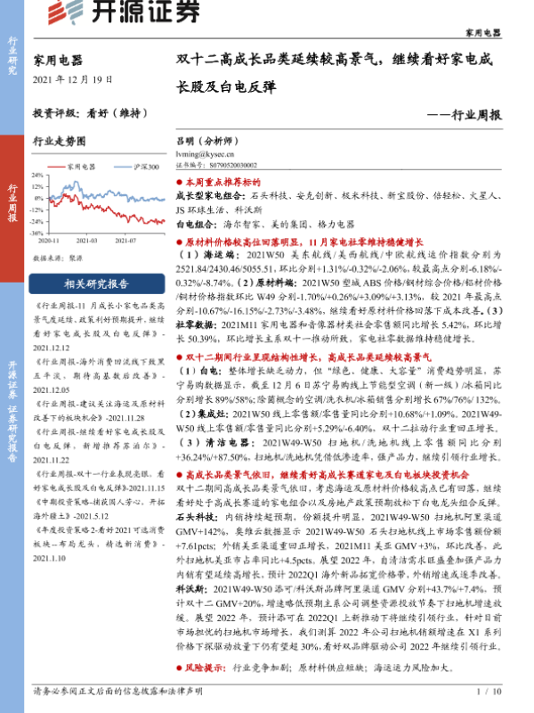 【开源证券】【20211219】20211219-开源证券-家用电器行业周报:双十二高成长品类延续较高景气,继续看好家电成长股及白电反弹-10页 行业研究