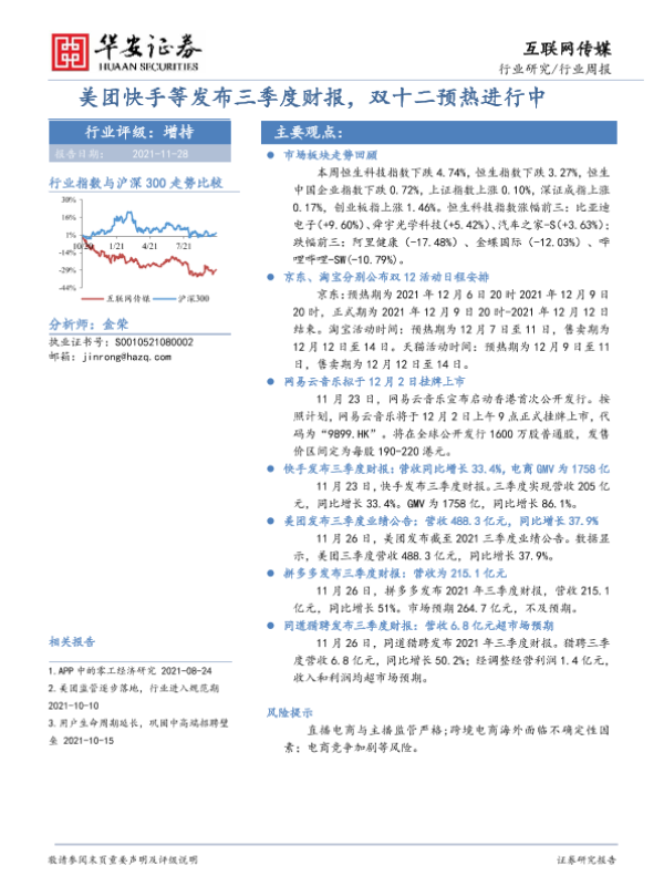 【华安证券】【20211128】20211128-华安证券-互联网传媒行业周报:美团快手等发布三季度财报,双十二预热进行中-18页 行业研究