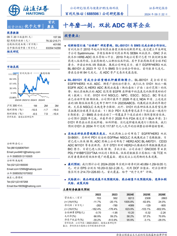 【海通证券】【20240922】百利天恒-U(688506)公司研究报告:十年磨一剑,双抗ADC领军企业-26页 行业研究