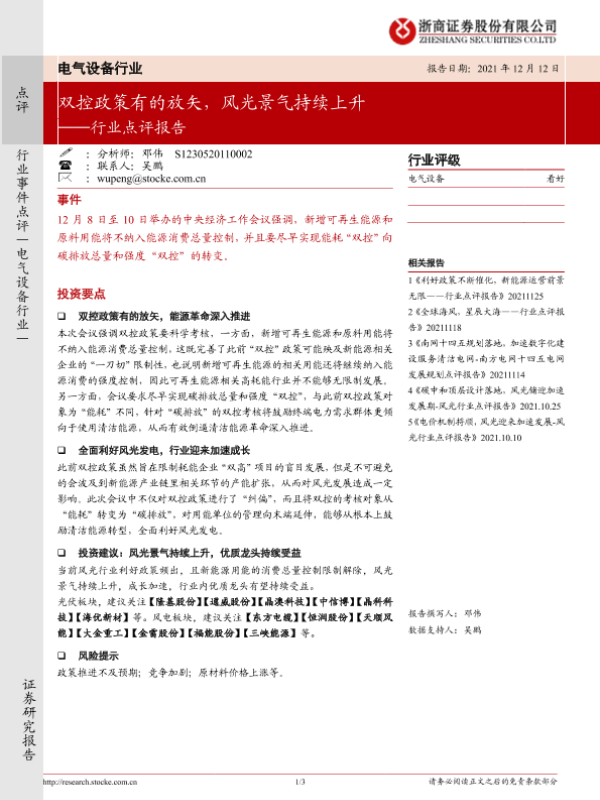 【浙商证券】【20211212】20211212-浙商证券-电气设备行业点评报告:双控政策有的放矢,风光景气持续上升-3页 行业研究