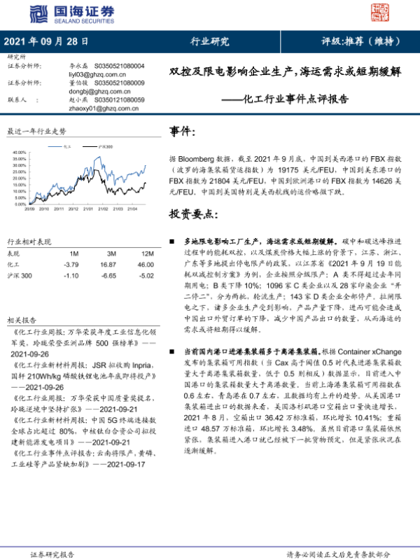 【国海证券】【20210928】化工行业事件点评报告:双控及限电影响企业生产,海运需求或短期缓解-6页 行业研究