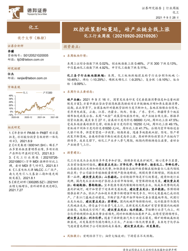 【德邦证券】【20210928】20210928-德邦证券-化工行业周报:双控政策影响蔓延,硅产业链全线上涨-22页 行业研究