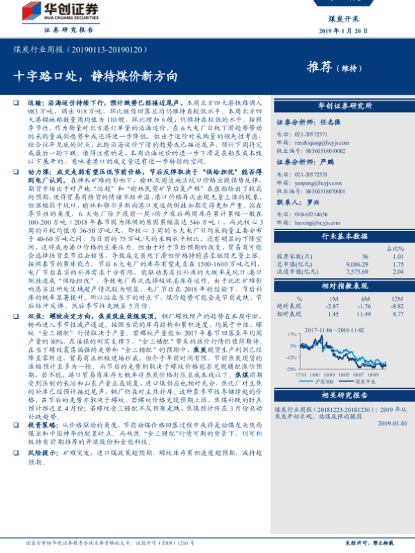 【华创证券】【20190120】20190120-华创证券-煤炭行业周报:十字路口处,静待煤价新方向-15页 行业研究