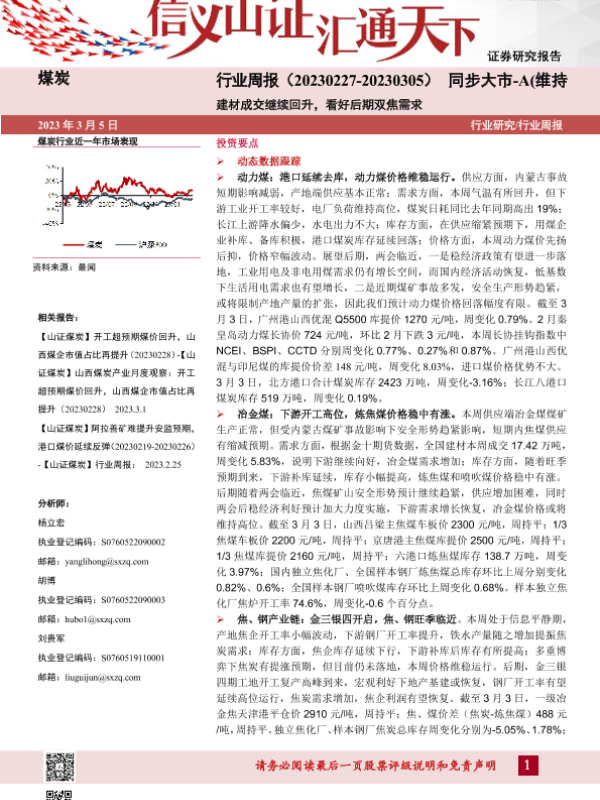 【山西证券】【20230305】煤炭行业周报:建材成交继续回升,看好后期双焦需求-19页 行业研究