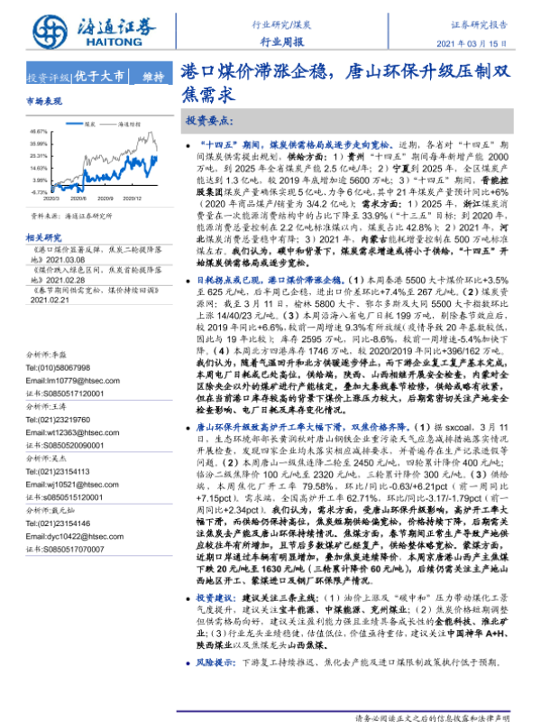 【海通证券】【20210315】20210315-海通证券-煤炭行业周报:港口煤价滞涨企稳,唐山环保升级压制双焦需求-2页 行业研究