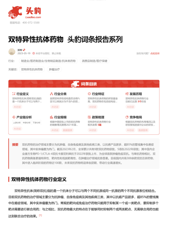 【头豹研究院】【20230707】双特异性抗体药物-15页 行业研究