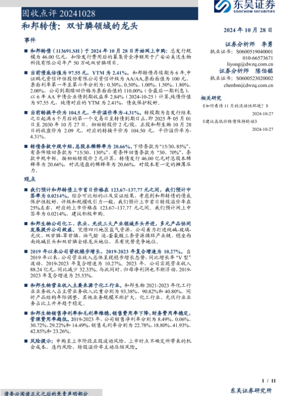 【东吴证券】【20241028】固收点评:和邦转债,双甘膦领域的龙头-11页 行业研究