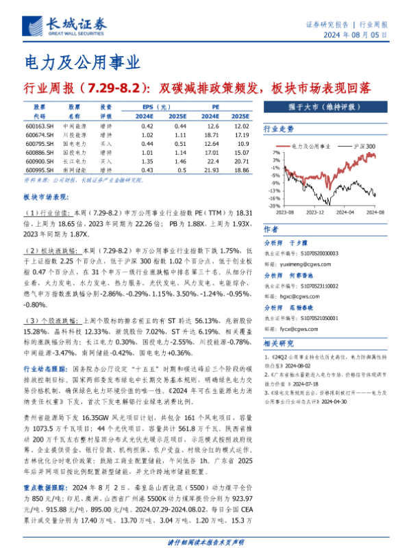 【长城证券】【20240805】电力及公用事业行业周报:双碳减排政策频发,板块市场表现回落-15页 行业研究