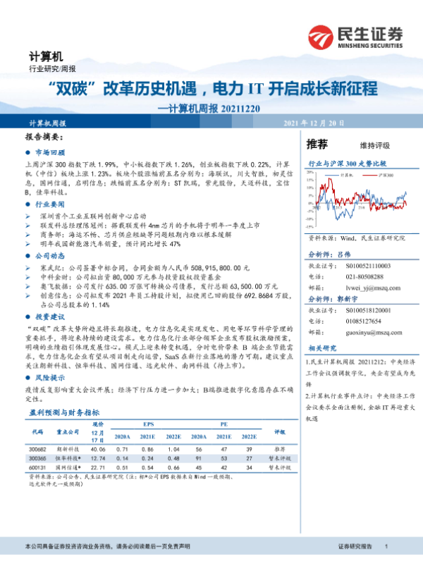 【民生证券】【20211220】“双碳”改革历史机遇,电力IT开启成长新征程—计算机周报 20211220-26页 行业研究