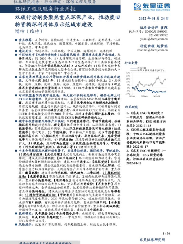 【东吴证券】【20220124】环保工程及服务行业周报:双碳行动纲要聚焦重点环保产业,推动废旧物资循环利用体系示范城市建设-36页 行业研究