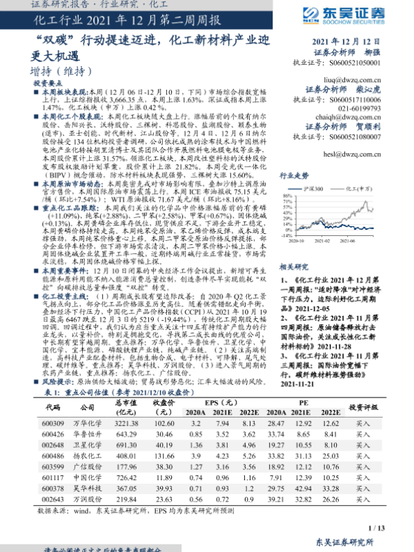【东吴证券】【20211212】化工行业2021年12月第二周周报:“双碳”行动提速迈进,化工新材料产业迎更大机遇-13页 行业研究