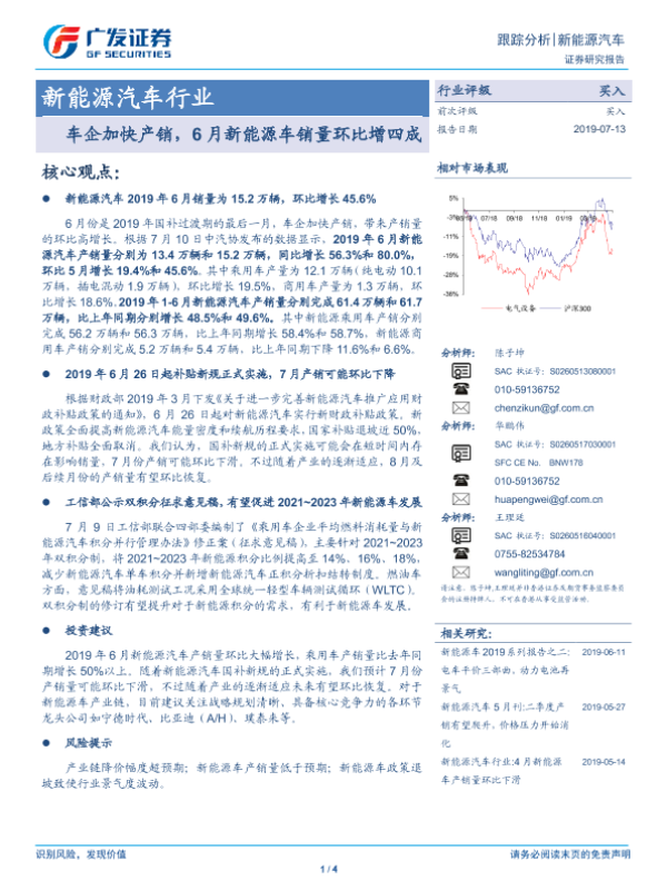 【广发证券】【20190713】车企加快产销,6月新能源车销量环比增四成-4页 行业研究