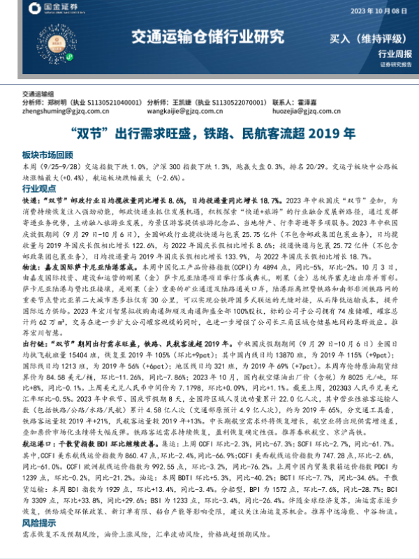 【国金证券】【20231009】2023年10月09日更新-【国金证券】交通运输仓储行业研究-“双节”出行需求旺盛-铁路、民航客流超2019年-14页 行业研究