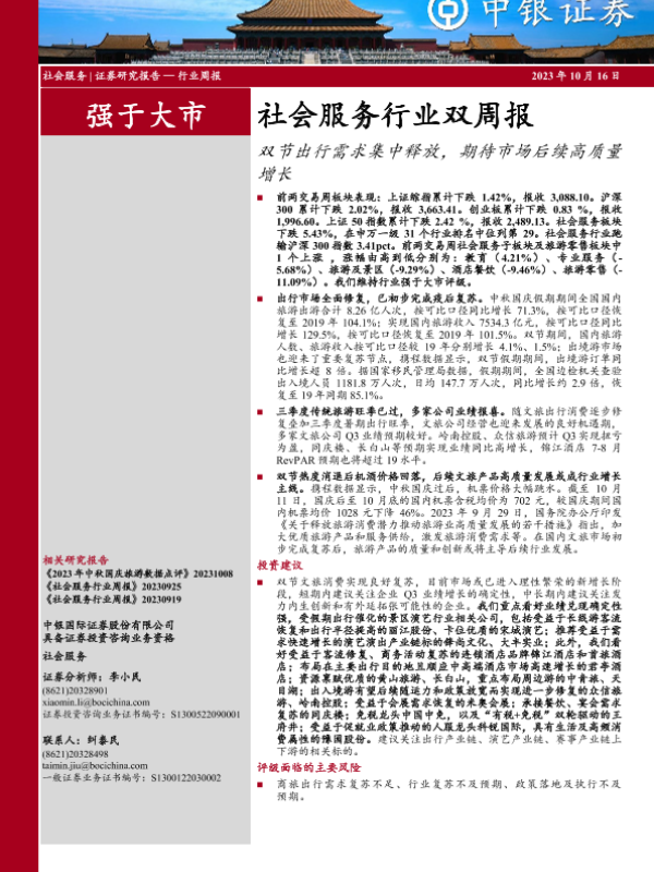 【中银证券】【20231016】社会服务行业双周报:双节出行需求集中释放,期待市场后续高质量增长-20页 行业研究