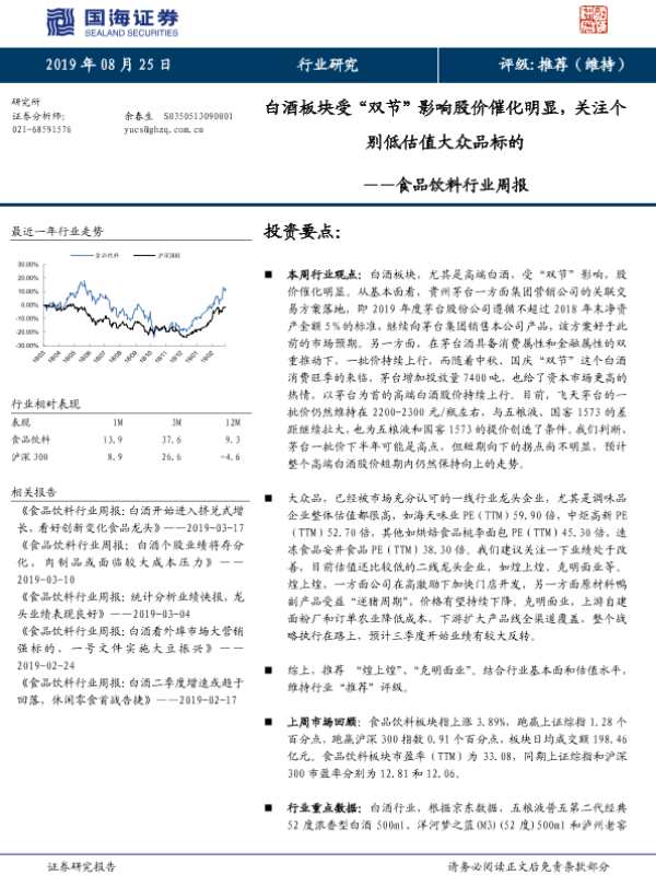 【国海证券】【20190825】食品饮料行业周报:白酒板块受“双节”影响股价催化明显,关注个别低估值大众品标的-21页 行业研究