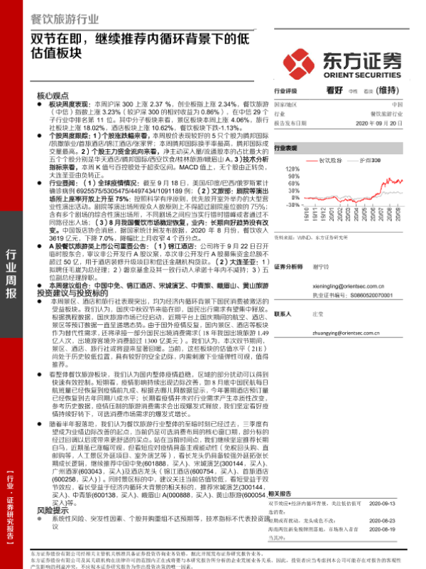 【东方证券】【20200920】餐饮旅游行业周报:双节在即,继续推荐内循环背景下的低估值板块-20页 行业研究