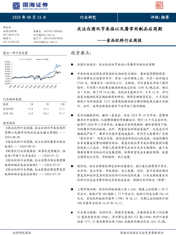 【国海证券】【20200816】20200816-国海证券-食品饮料行业周报:关注白酒双节来临以及屠宰肉制品后周期-20页 行业研究