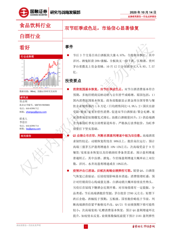 【国融证券】【20201014】食品饮料行业:双节旺季成色足,市场信心显著修复-3页 行业研究