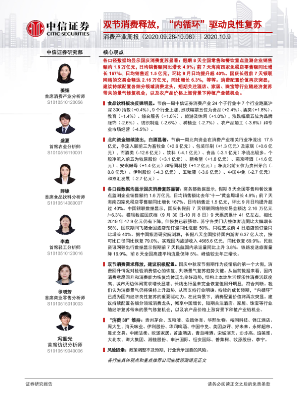 【中信证券】【20201009】消费产业周报:双节消费释放,“内循环”驱动良性复苏-10页 行业研究